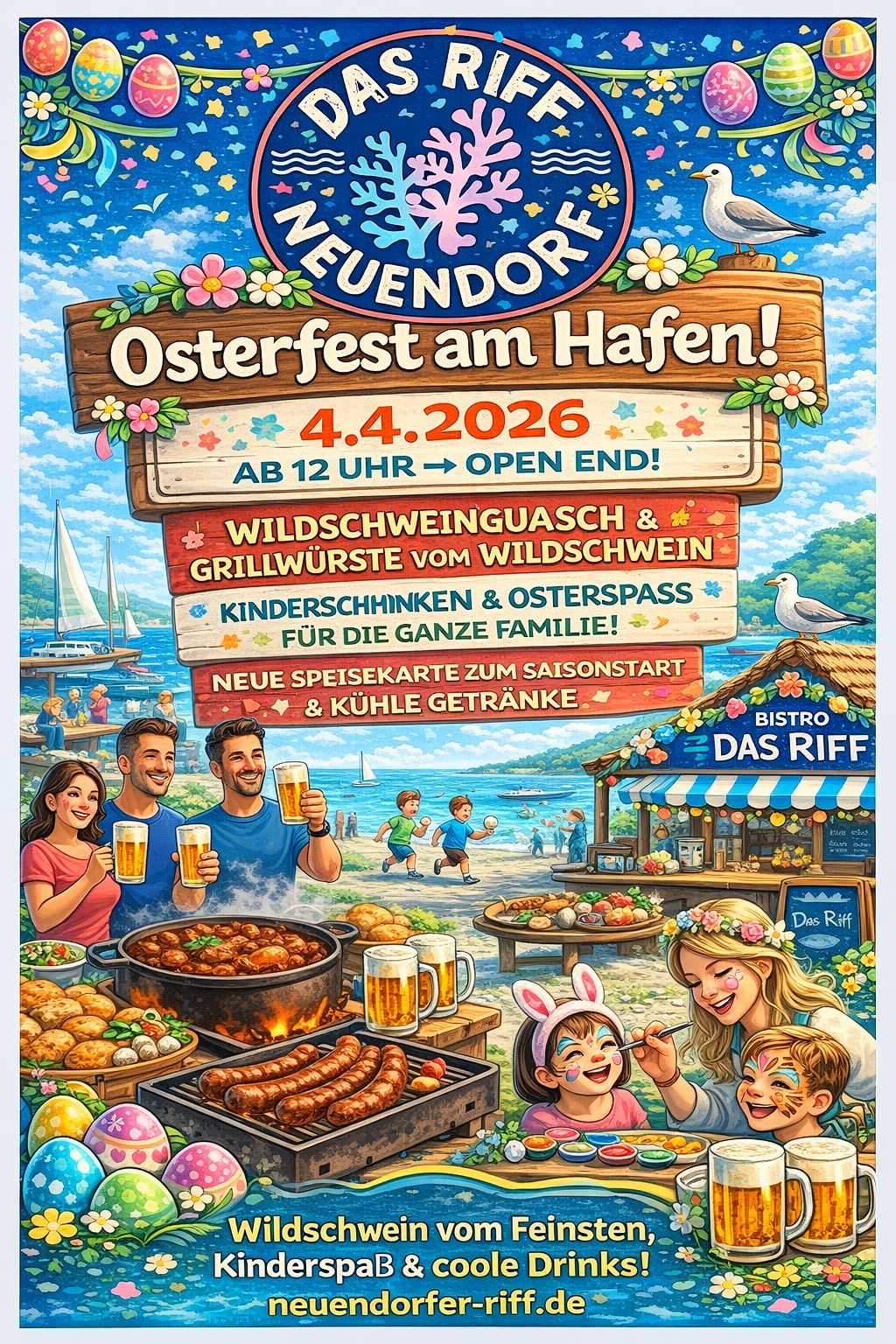 Am 4. April 2026 laden wir euch herzlich zum Osterfest am Neuendorfer Riff ein. Ab 12 Uhr erwartet euch ein stimmungsvoller Tag direkt am Hafen mit leckerem Wildschweingulasch, gegrillten Wildschweinwürsten und kühlen Getränken.